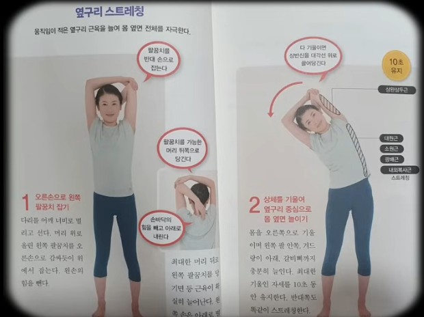 상체를 기울여 옆구리 중심으로 몸 늘이기. 몸을 오른쪽으로 기울이며 왼쪽 팔 안쪽 겨드랑이 아래 갈비뼈까지 충분히 늘인다. 최대한 기울인 자세를 10초 동안 유지한다. 반대쪽도 똑같이 스트레칭한다.