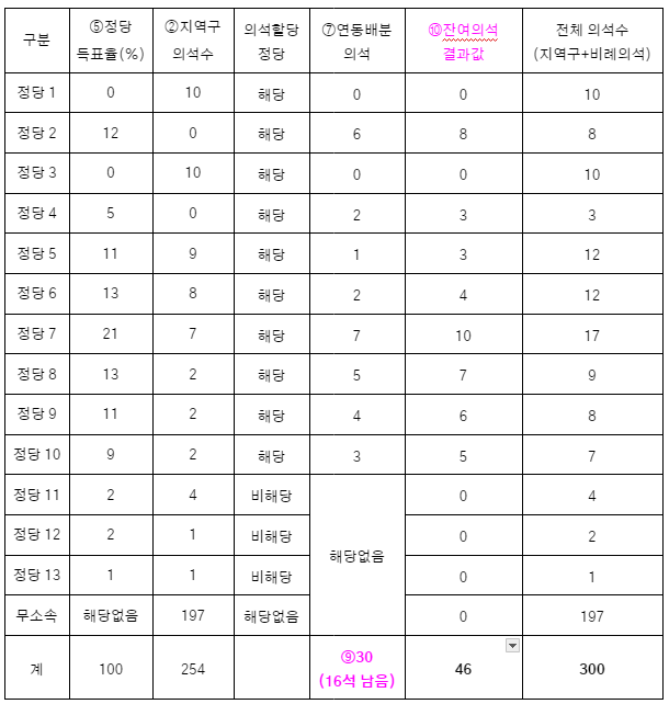 - 연동 배분의 석 산출 후 46석을 초과할 경우(조정 의석 배분), 미달할 경우(잔여 의석 배분) 추가 계산 필요.