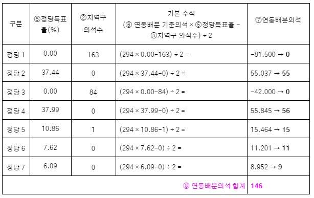 - 연동 배분의 석 : 산출 시 소수점 첫째 자리에서 반올림한 정수 우선 배분, 결괏값이 1보다 작은 경우 0으로 처리한 의석을 말합니다.