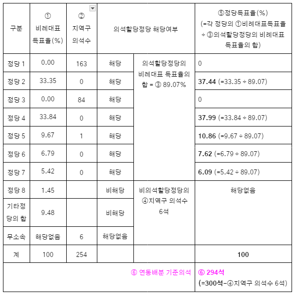 *⑤정당득표율 계산 근거 : 공직선거법 제189조 ③ 제2항의 비례대표 국회의원 선거 득표 비율은 각 의석 할당 정당의 득표수를 모든 의석 할당 정당의 득표수의 합계로 나누어 산출한다. / 제3항이 말하는 제2항은 2단계에서 설명할 연동 배분 의석 수를 말합니다.