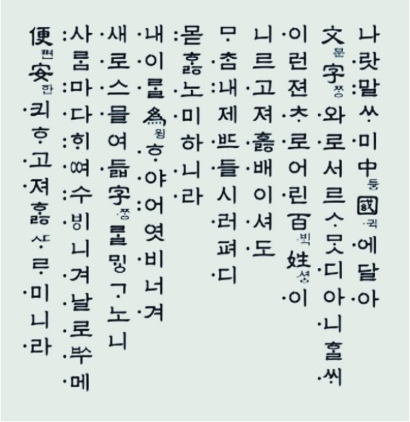 첫째, 우리나라의 말이 중국 말과 달라서 한문 글자와는 서로 잘 통하지 아니한다.