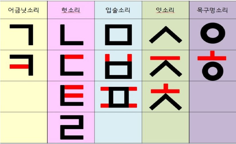 앞서 살펴보았듯이 한글 자음의 기본 형태소는 ㄱ, ㄴ, ㅁ, ㅅ, ㅇ으로서 사람이 소리를 낼 때의 발음기관을 면밀히 관찰한 후 그것의 기능을 형상화한 것입니다.